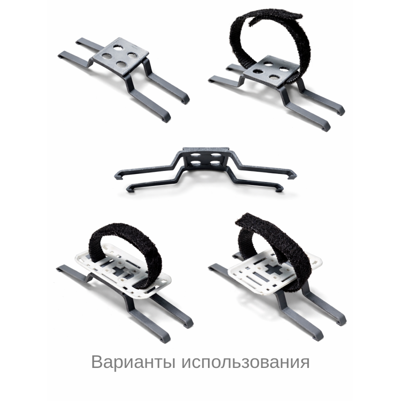 Крепление может использоваться с липучкой, хомутом, стяжкой. Очень прочно крепится к защите пропеллеров.